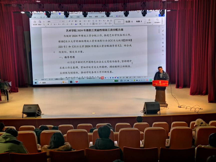 会上,梁明明副院长通报了本年度研究生工作及科研工作的情况,对下学期的研究生教学安排、学术讲座、基金申报等工作做出了具体安排。彭琛副院长对本学期期末考试后续工作和下学期教学任务作了安排。陈志雄副书记提醒老师们做好学生安全离校返家相关工作和下学期教代会工作安排。曹军院长详细讲解了2024年度学院奖酬金分配方案,经全院教师表决,最终通过了该方案。马小佼书记通报了人力资源部发布的长大学者岗位引进情况、基建处发布的东校区研究生宿舍建设项目进展情况、2025年新年音乐会和新年健康跑开展情况、副书记陈志雄到荆州市教育局挂职情况、2024年度学院常规指标考核结果和教职工年度考核工作相关情况;安排了下学期的组织生活会和民主生活会相关工作;同时提醒老师们注意寒假的放假时间,要求每位老师在放假前对所属办公区域、教室、画室、展厅、音乐厅等场所进行一次安全检查和消防检查;强调要求大家要廉洁过节,严守纪律底线。随后,全体教职工对学院前期选出的院训开展了投票,提出了意见和建议。