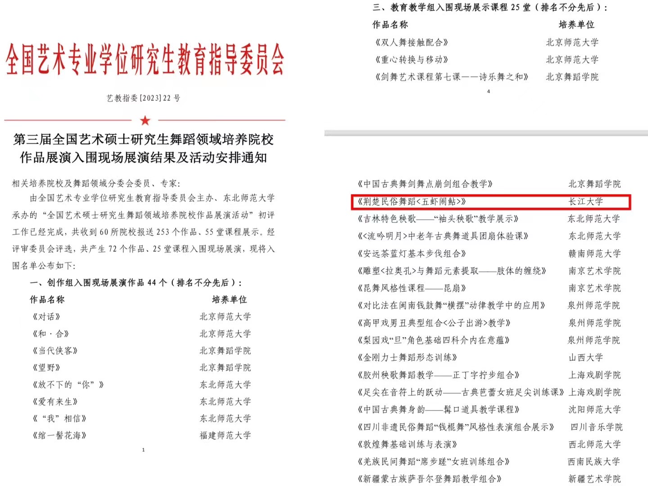 本次展演共收到60所院校报送253个作品、55堂课程展示,经评审委员会评选,共产生72个舞蹈作品、25堂课程入围现场展演。经过校研究生部组织,yl6776永利集团推荐,全国艺教指委严格选拔,最终我院2022级艺术硕士舞蹈教育方向研究生李佳颖、刘云龙报送的课程《荆楚民俗舞蹈—〈五虾闹鲇〉》脱颖而出,成功入围现场展演。