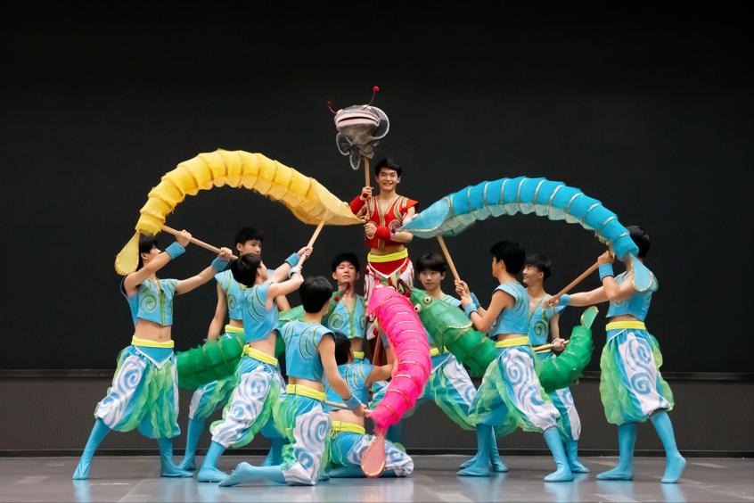 “五虾闹鲇”俗称“虾子灯”,是流传于江汉平原的汉族民间花灯舞蹈,具有浓郁的平原水乡气息和荆楚民俗风格,被列入国家级非物质文化遗产。五虾,代表东西南北中五个方向,被当地人赋予五福献寿的寓意,“闹鲇”与“闹年”同音,代表人们年年有鱼的美好愿望。“五虾闹鲇”多于春节和喜庆活动时表演,通过鱼虾友好嬉戏、追逐嬉闹,反映了人们对普天同庆闹新年,众生和谐共处的美好向往。长大学子将“五虾闹鲇”从民间带到舞台,从荆州带到全国。对中国优秀传统民俗文化的传承与弘扬更是长大学子的学习追求。