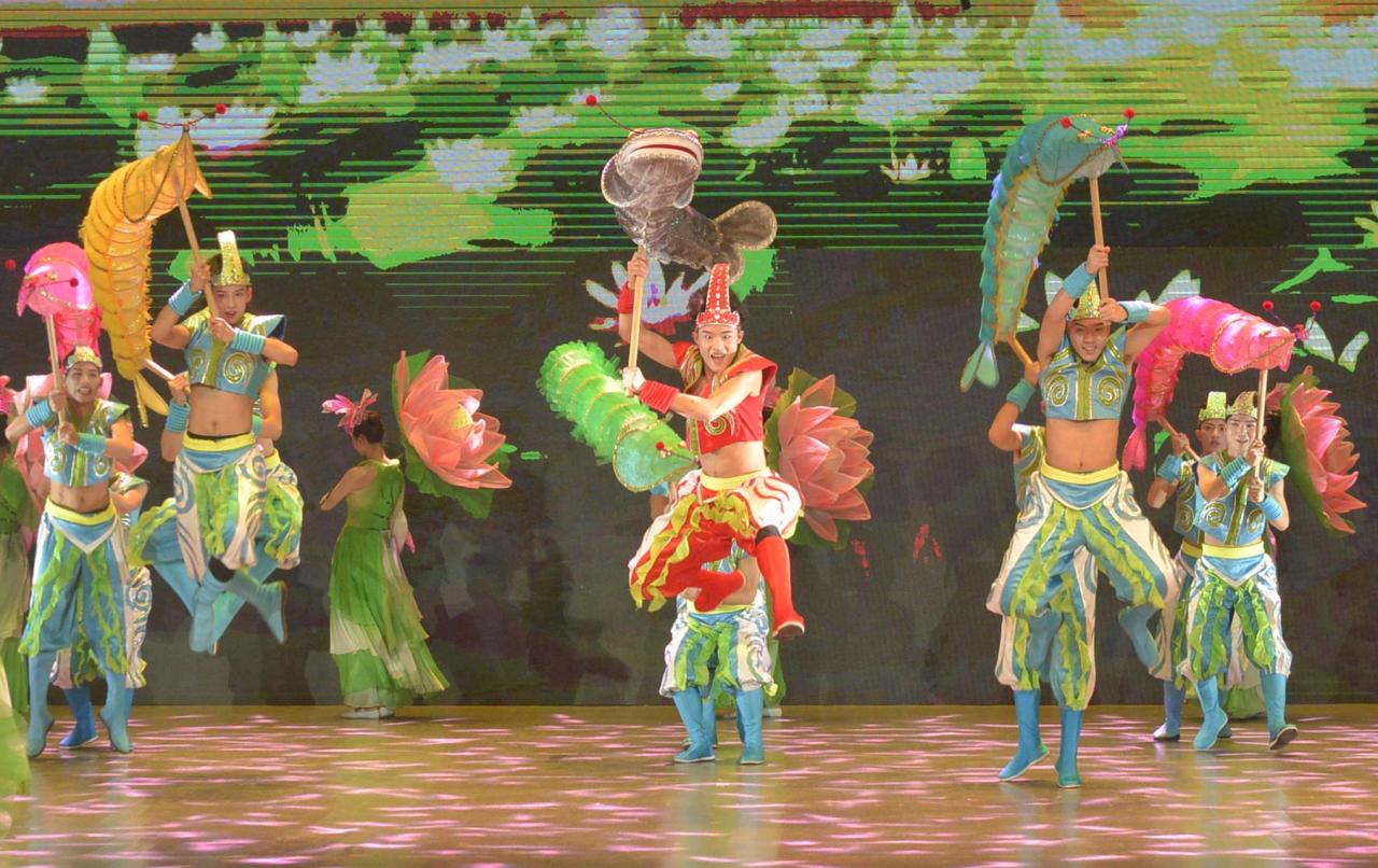 开场舞《五虾闹鲇》是荆州市省级非物质文化遗产舞蹈项目,并于今年在我校yl6776永利集团创建传承基地,演员们以其灵活多变的身手,娴熟的动作配合,运用舞蹈道具五只彩虾与一只鲇鱼在上下穿游、自如翻飞的舞动中表现出鱼虾在水中和谐共生、快乐嬉戏的情景,反映了人们对众生和谐共处的追求,极具浓郁的水乡气息和荆楚地方特色。