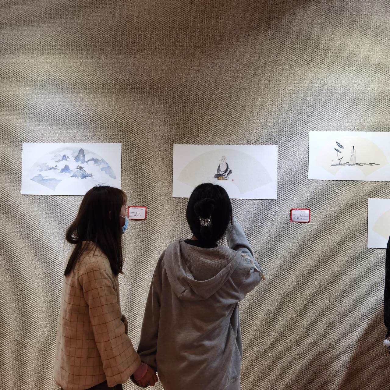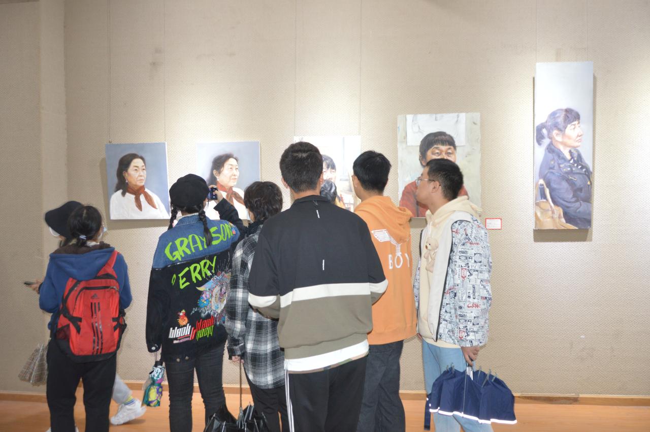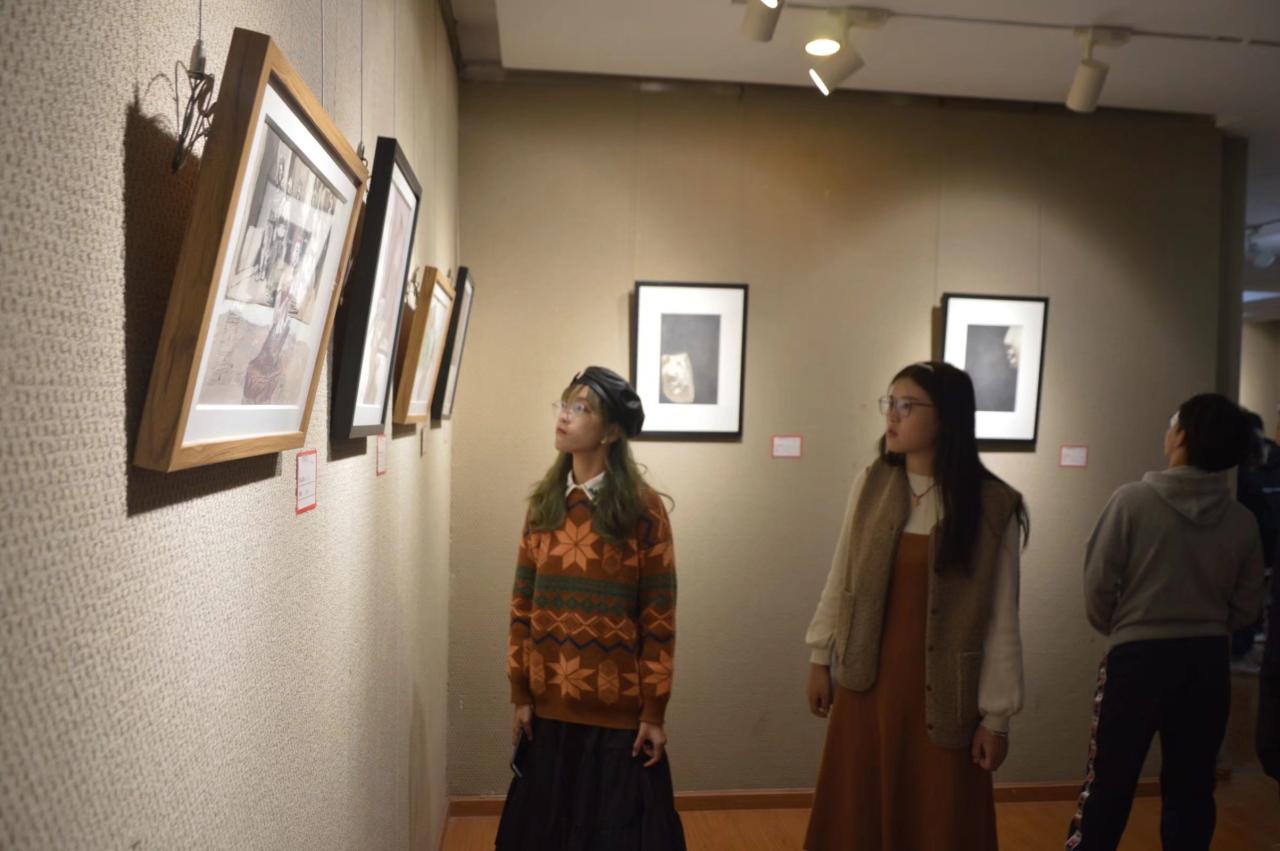 下午15时30分,抗疫系列学生美术作品展正式开幕,2020级新生有序入场,展厅中一气呵成的白描,厚重的油画,惹得同学们时而观望时而拍照,并积极的与参加画展的学长学姐进行交流。他们听着学长学姐的讲解,个个都露出憧憬和敬佩的目光,沉思着、想象着将今天的知识和经验该如何展现在今后的画面之中。