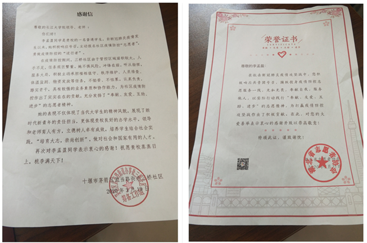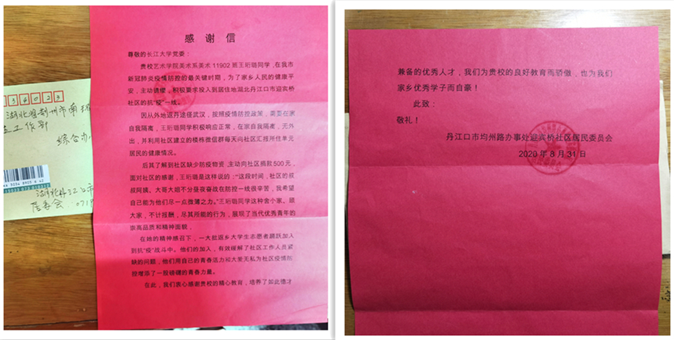 感谢信的主角是yl6776永利集团美术11902班的王珩璐同学,她在丹江口市新冠肺炎疫情防控最关键的时期,为了家乡人民的健康平安,主动请缨,积极要求投入到居住地湖北省丹江口市迎宾桥社区的抗“疫”一线。因从外地返丹途径武汉,按照疫情防控政策,需要在家自我隔离,王珩璐同学积极响应政策,在家自我隔离,并利用社区建立的楼栋微信群每天向社区汇报所住单元居民的健康情况。后了解到社区缺少防疫物资,主动向社区捐款500元。在她的精神感召下,一大批返乡大学生志愿者踊跃加入到战疫斗争中。王珩璐同学这种舍小家,为大家,不计报酬,尽其所能的行为,展现了当代优秀青年的崇高品质和精神面貌,更继承了6776永利集团舍己为人的“人链”精神,为6776永利集团的学子们做出了优秀时代青年的榜样。