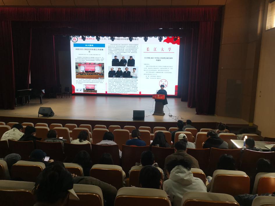 接下来,马小佼重点传达了校长刘勇胜和党委书记王建平在2025年学校工作部署会上的讲话内容和精神。刘勇胜校长强调,要以“四个更加”的理念和行动,深入实施“六大行动”、全面推进“六个倍增”,加快全国重点实验室等重大平台建设,引育一批国家级高层次人才,产出一批国家级重要成果,在国家级高层次人才引进、国家级重要成果产出、自主建设重大平台、自主培育重大人才、自主报批重大项目、自主产出重大成果和一流学科建设成效等方面取得新突破,力争在第六轮学科评估中整体水平达到新高度,推动各项核心办学指标再上新台阶。刘勇胜要求,为实现全年目标要做到“八个坚持”,构建“六项机制”、强化“六个意识”,并对当前和今后一段时期的改革重点做了说明和强调。校党委书记王建平在总结讲话时的主要内容和讲话精神,王建平书记要求,一是要以放心不下的责任感实现高水平安全;二是要以功成在我的使命感推动高质量发展;三是要以决战决胜的紧迫感提升能力素质。王建平强调,要树立勇创一流的使命意识,以更高的站位、更实的举措、更强的担当,为实现高水平安全、推进高质量发展贡献智慧和力量。领导干部要知责担责、知重负重、知压加压,攻坚克难、真抓实干,奋力实现年度目标任务,全力以赴打好打赢决胜之战,为加快建成中部地区崛起的重要战略支点,奋力谱写中国式现代化湖北篇章、建设教育强国作出新的更大贡献!