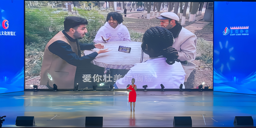 应市委统战部邀请,yl6776永利集团教师傅小草携音表12401学生邱娜以及国际学生茜卡在主题展示环节演绎了原创MV《讲好中国故事——我爱这辽阔的地方》。邱娜扮演着中国语言、中国故事的传播者,她逐字逐句地教非洲女孩汉字,给她讲中国故事,教她唱中国歌。
