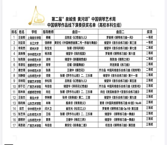 (通讯员 饶婷婷)2025年是中国钢琴音乐诞生110周年,也是世界反法西斯战争胜利80周年。为纪念这两个重要的历史时刻,山东省音乐家协会以“和合共生”为主题举办第二届“泉城情,黄河颂”中国钢琴艺术周,通过钢琴音乐的艺术形式,展现中华民族对和平的追求对黄河文化的热爱。本次比赛选手演奏水平高,竞争十分激烈,通过线上匿名初审,线下匿名终审的激烈角逐,我院2023级本科生刘亚菲荣获第二届“泉城情,黄河颂”中国钢琴艺术周中国钢琴作品全国展演一等奖,指导老师饶婷婷教授。