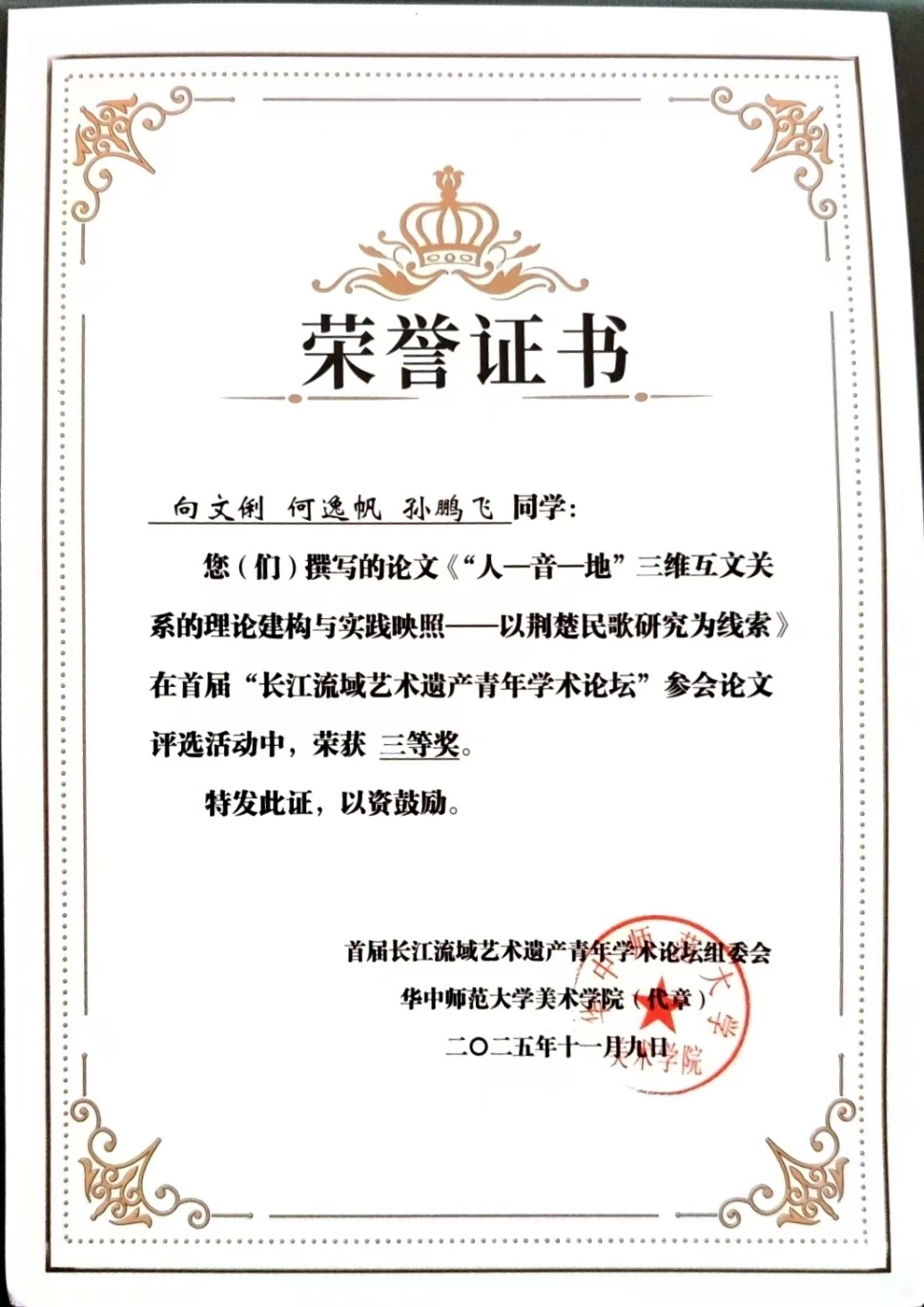 向文俐、何逸帆与孙鹏飞老师合作的论文《“人—音—地”三维互文关系的理论建构与实践映照——以荆楚民歌研究为线索》入选第四分论坛“荆楚艺术遗产研究”专题。该文立足荆楚民歌传承发展需求,构建“人—音—地”三维分析框架,为区域音乐研究提供了整体性、动态性的新视角,并对教育传承等实践路径提出前瞻思考。该论文最终荣获论坛三等奖。