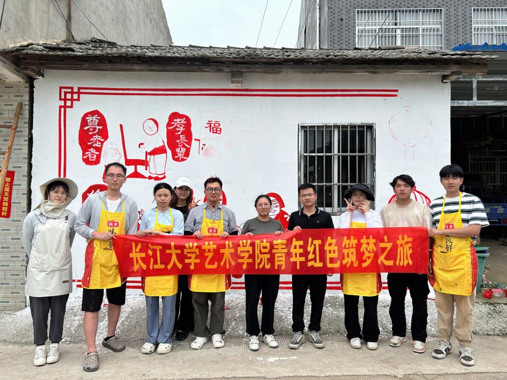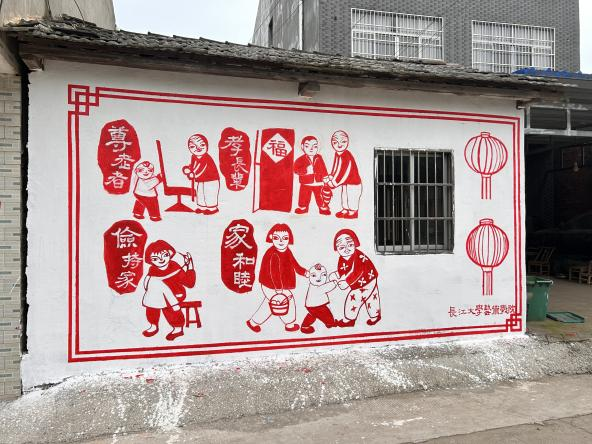 乡村振兴既要塑形,也要铸魂。艺术是一条润泽心灵、涵养乡风的河流。团队把“提升乡村美育文化”作为一项重要工作内容,并组织师生共9人前往监利市程集镇堤头村开展为期三天的“青春振兴,绽放“艺”彩”对口帮扶工作,无偿为堤头村绘制了4幅共计约420平方米的墙绘作品,与村民面对面,了解村名对理想生活的愿景,用画笔呈现堤头村特色的墙绘作品。