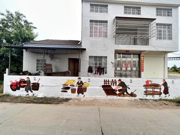 八名团队成员绘画的面积约420平方米,绘画过程中,团队成员默契配合,踏实肯干,及时与镇政府沟通调整方案。围绕各种主题,为堤头村创作了《采莲捕鱼图》、《绿水青山就是金山银山》《中华传统美德图》《酿酒流程图》4幅墙绘作品,精美的墙绘作品收获了村民们的好评和点赞,这些墙绘不仅美化了乡村环境,也将艺术融入乡村生活,将美育有意识的融入自然资源。