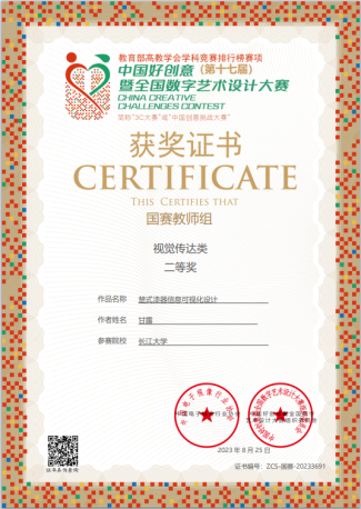 近日,第十七届中国好创意暨全国数字艺术设计大赛全国总决赛落下帷幕。本届大赛共有1472所大学参赛,其中教师组作品38673件。通过激烈比拼,我院教师甘露创作的作品《楚式漆器信息可视化设计》荣获国赛二等奖,展示了他在艺术设计方面的深厚造诣。