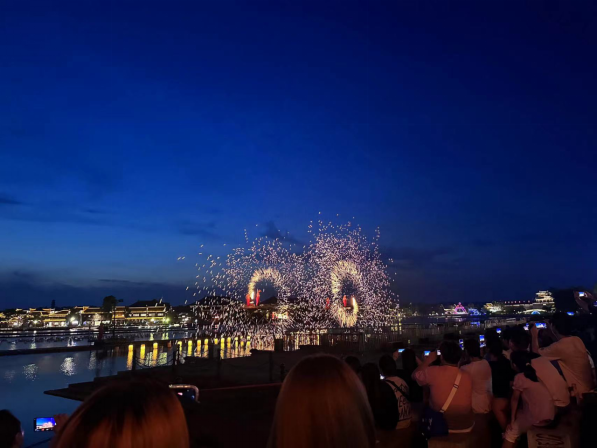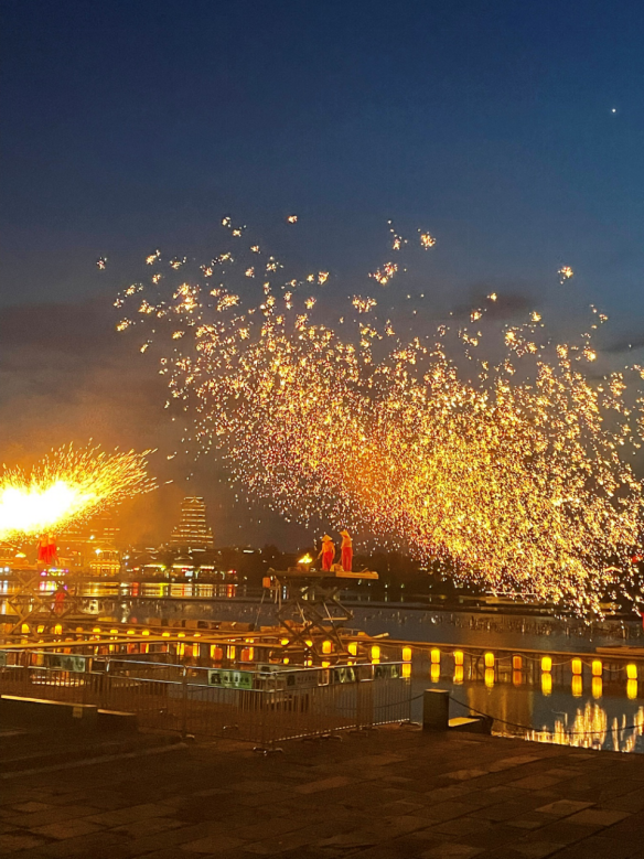 晚上,同学们欣赏了壮丽非遗表演——打铁花。