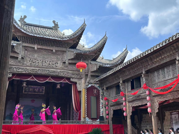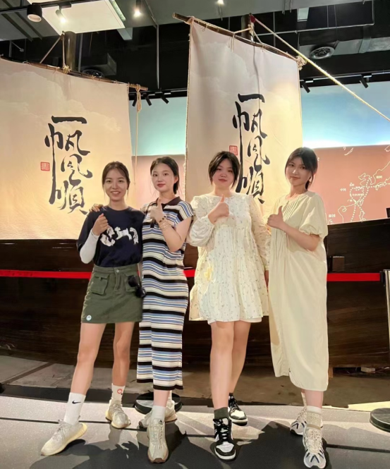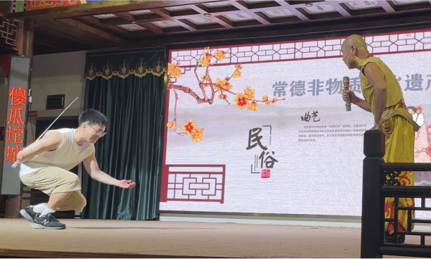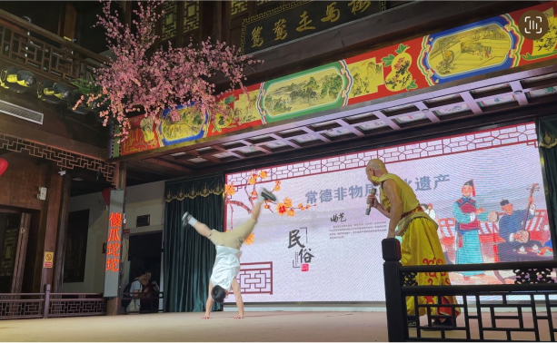 第三天,上午早前往常德河街剧场。这里真实还原了曾被沈从文称为“湘西大码头”的常德河街场景和码头文化。整条街的景致也复制了那个年代的河街景致,林立的商铺之间,严格按史料复建的麻阳会馆、鸳鸯走马楼等核心建筑气势恢宏,依稀可见当年戏院、洋行、税局、会馆、茶楼、客栈遍布河街的盛况。学生们在这里观看非遗国潮文化展演,并跟非遗传承人学习交流。