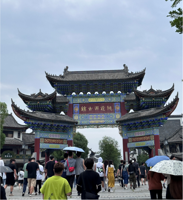 第二天,早上7点30分在yl6776永利集团门口乘车,一起出发前往本次采风第一站,湖南省常德市桃花源古镇。桃花源古镇是东晋末到刘宋初杰出诗人、辞赋家、散文家陶渊明先生的代表作《桃花源记》的原型地。桃花源古镇拥有大型人文主题公园、桃花广场、奔月双塔、古戏台、庙会广场、城隍庙、文庙、钱庄、镖局、望湖亭、古吊桥、桃花溪、五柳河、城门楼、入口主、次牌坊等,学生们在烈日下,饶有兴趣的参观了大部分景点。