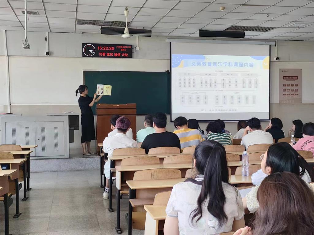 义务教育课程标准是基础教育阶段最为核心的操作指南,同时也是国家教育方针意志具体化的体现,为课程教学实施提供了明确的依据。随着对中国学生核心素养教育的推行,新课程改革与融合的深入,2022年4月21日教育部发布了2022年版最新课程标准艺术新课程标准。为了让同学们进一步了解新的课程标准,为教育实习做好准备,在此次《教育见习》课程的内容中,我院还特意邀请了荆州市教育科学研究院音乐教研员程丹老师于6月17日14:30给2019级音乐学专业同学带来了关于义务教育(艺术)课程新课标的专题讲座。程老师在讲座中分析了人音版中小学音乐课本,并结合2022版新课标解读了中小学音乐课程内容与评价,并分享了优秀的课例。此次讲座内容丰富,形式多样,互动环节现场气氛轻松活跃,同学们纷纷表示讲座为他们解答了很多的疑惑,希望能有更多的机会深入学习。