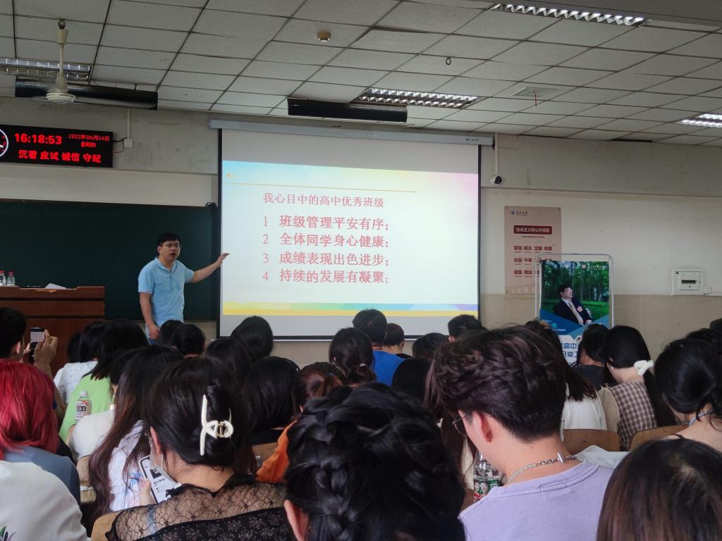 此外,沙市中学语文高级教师、优秀班主任陈亮老师也走进了我们的课堂。陈老师在《漫谈高中班主任日常工作》的讲座上指出,作为一个好的班主任不仅要有扎实的理论基础,还要有丰富的教育教学经验,更要有良好的教育品德。陈老师从自身经验出发,分析了班主任应该具备的优良品质,班主任与其他各科老师、家长、学生之间的关系以及班主任如何治理好班级。使同学对教师这份职业的艰辛有了更深入的了解,为以后作为老师的我们担任起班主任的重担提供了重要帮助。