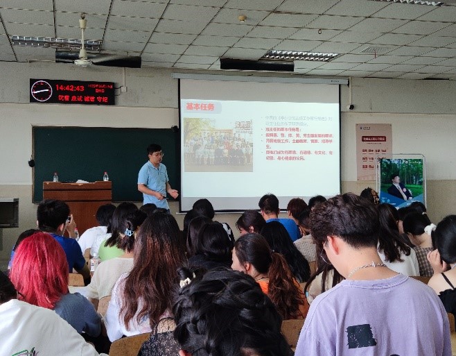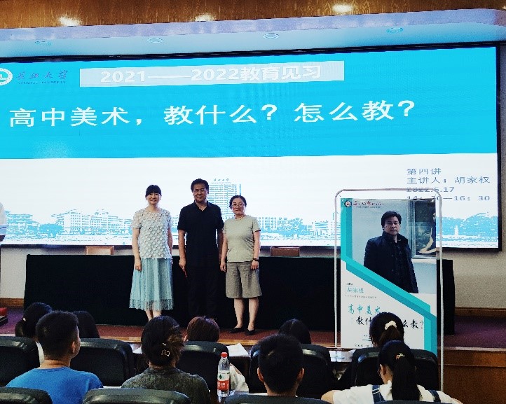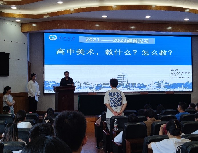 第四场由荆州市教育科学研究院副院长、高级中学美术教师胡家权老师讲授的《高中美术,教什么?怎么教?》。胡老师围绕2022年《义务教育艺术课程标准(2022年版)》展开系统的解读,结合最新人美版美术教材及教师教学案例,提出如何让一节课,变的生动有趣,重难点突出。使学生们理解新的课程标准规范教案书写内容与格式,给正要走向讲台的同学们更深刻的理解到作为一个好老师不仅要有扎实的理论基础,更要有丰富的教育教学经验。
