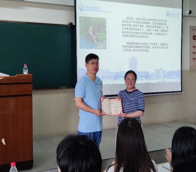 第三场是由沙市中学语文高级教师、优秀班主任陈亮老师主讲的《漫谈高中班主任日常工作》。陈老师从自身经验出发,分析了班主任应该具备的品质,班主任与其他各科老师、家长、学生之间的关系以及班主任如何治理好班级,使同学对教师这份职业的艰辛有了更多的了解,也为以后作为美术老师的我们担任起班主任的重担提供了帮助。
