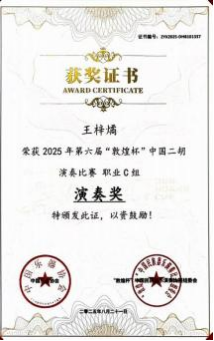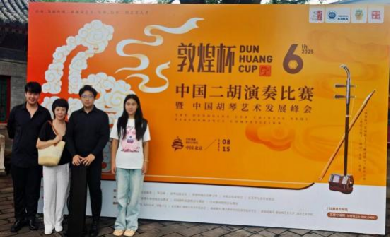 2025年8月,第六届“敦煌杯”中国民族器乐(二胡)演奏比赛在北京金帆音乐厅和北京西域区少年宫隆重举行。我校选送2名学生赴京参赛,分别是研究生二年级的朱星宇(音乐QZ241)和本科三年级的王梓燏(音表12301)。经过激烈角逐,朱星宇同学获职业C组铜奖,王梓燏同学获职业C组优秀奖。