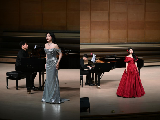 音乐会分为上下半场。上半场聚焦于西方艺术歌曲与歌剧经典。胡欣怡以德语艺术歌曲《小夜曲》开场,精准地把握了舒伯特的浪漫主义风格;在拉赫玛尼诺夫的《别唱吧 美人》中,她以醇厚的中音区演绎出普希金诗歌的深沉悲怆;特邀嘉宾孙文迪助阵的《花之二重唱》,更以双声部叠唱重现了法兰西歌剧的东方幻境。下半场则转向中国经典作品,从苏轼《定风波》的文人风骨到林徽因《一首桃花》的民国雅韵,她以汉语声韵诠释了传统文化的精髓;终曲内蒙古民歌《鸿雁》经现代编配后,成为游子致献母校的深情告白。