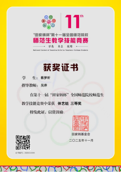 在本次竞赛中,yl6776永利集团2022级学生蔡梦昕在吴萍老师的悉心指导下,深入研究新课标精神,反复打磨教学设计,凭借扎实的专业功底和出色的教学表现,荣获本科生组全国三等奖。这一佳绩不仅展现了蔡梦昕同学良好的综合素质和教学能力,也充分体现了yl6776永利集团在师范生培养方面的扎实基础和持续成效。