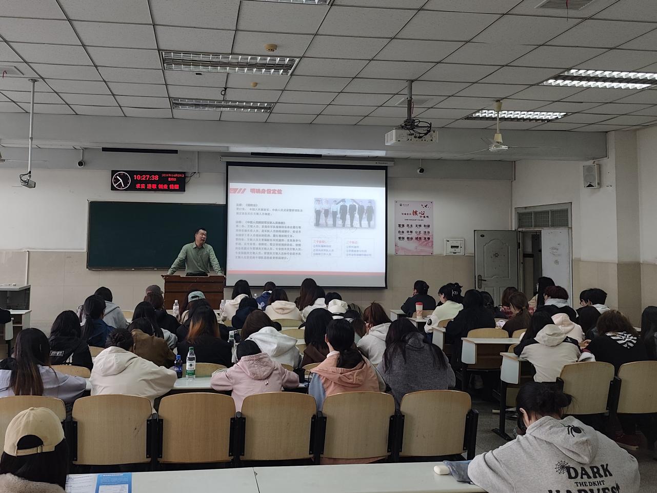 与此同时,12教303教室,刘老师系统梳理了艺术专业适配的军队文职岗位体系,包括文工团声乐/舞蹈演员、音乐编导、舞美设计等艺术相关岗位。“军队文职既保障稳定的职业发展,又能充分发挥艺术专业特长”,他通过岗位匹配案例,指导学生如何将演出经历、获奖证书等转化为报考优势,并详解了公开招考、直接引进等多元招录路径。