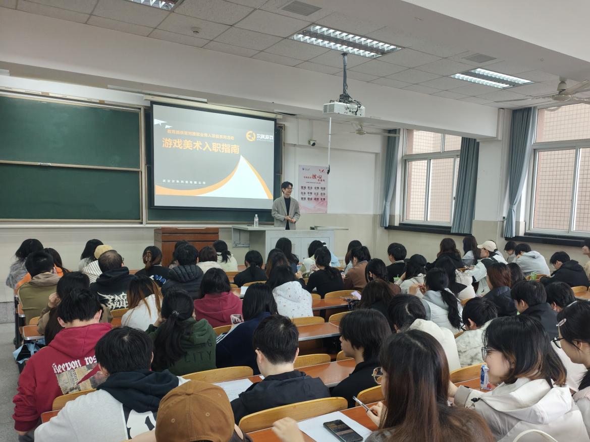 在主教308教室,涂经理聚焦游戏美术行业发展趋势,结合自身多年项目管理经验,从行业现状、岗位细分、技能要求三大维度展开讲解。他详解了游戏美术创作的核心流程,强调“艺术审美与技术工具并重”“既要符合项目风格规范,又要凸显个人创意辨识度”。现场,他还解答了学生关于行业准入门槛、新人成长路径等疑问,鼓励学子将美术专业功底与数字技术相结合,把握文创产业发展机遇。