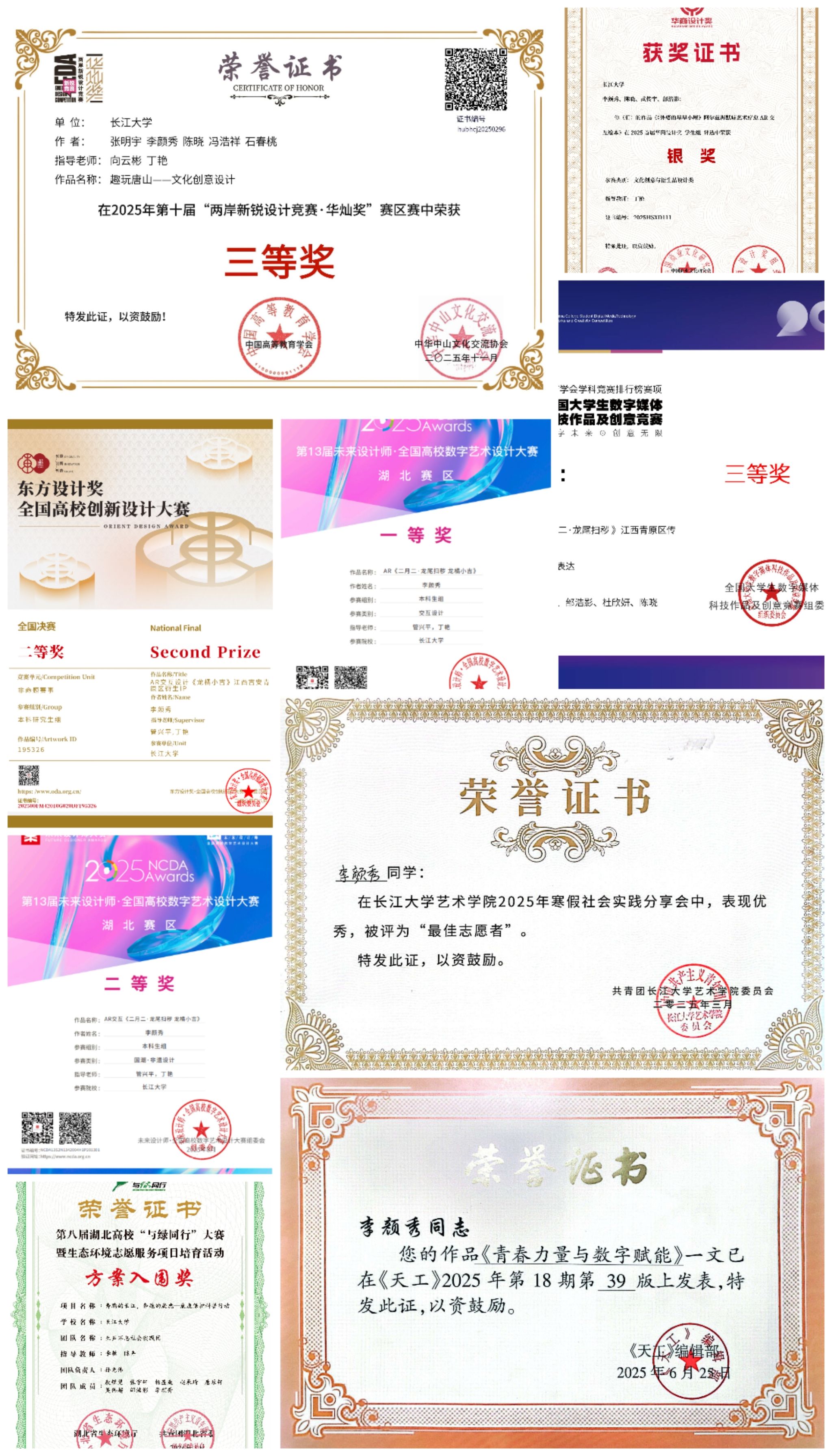 回望过去三年,李颜秀先后获得国家级奖项15项、省级奖项10余项,发表学术论文1篇,主持国家级大创项目1项,参与志愿活动30余项。她深知荣誉属于过去,未来任重道远。“为天地立心,为生民立命,为往圣继绝学,为万世开太平”是她毕生的追求。作为一名光荣的共青团员(预备党员),她将继续深耕美术设计领域,探索艺术与科技、传统与创新的交汇点,用作品传递文化价值,用行动回应时代呼唤。